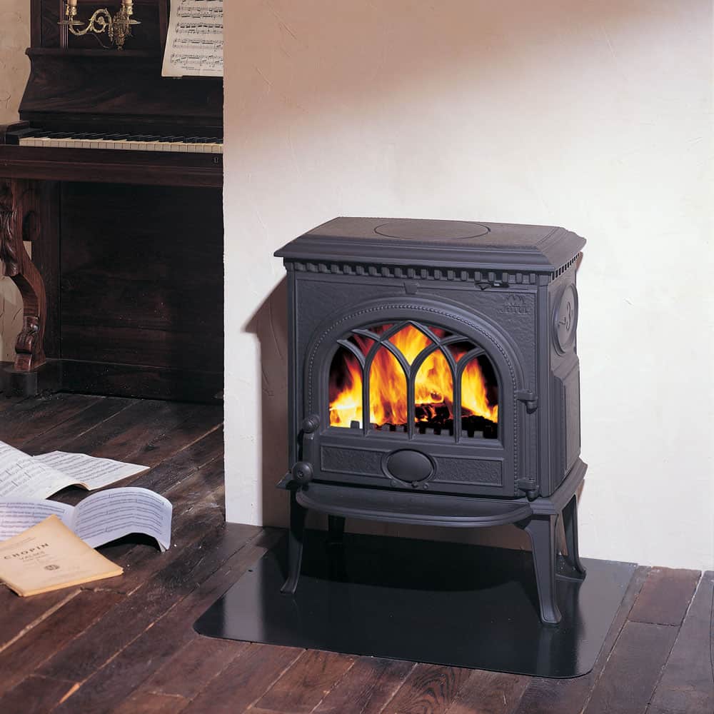 Чугунная печь-камин Jotul F 3 TD с традиционным видом горения, при среднем уровне обеспечивает 6.5 кВт, рассчитана на обогрев помещений площадью до 130 м2.