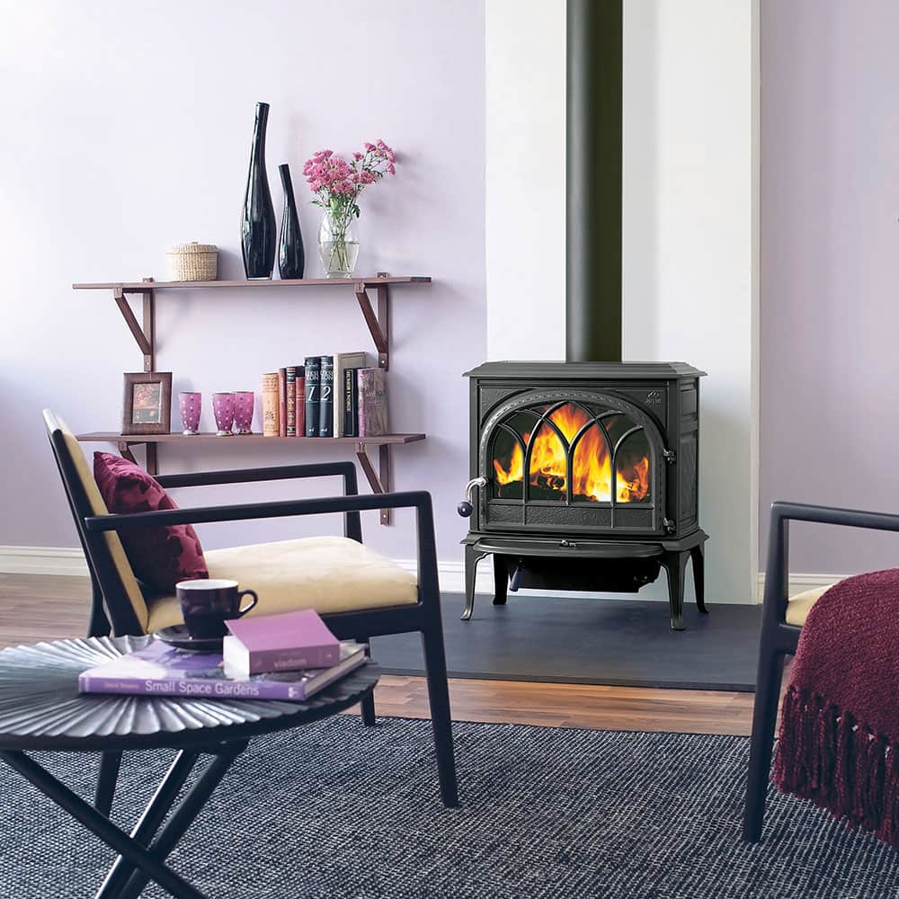 Чугунная печь-камин Jotul F 400 ECO CB BP, с функцией чистое горение “Clean Burn”, при среднем уровне горения обеспечивает 7 кВт, рассчитана на обогрев помещений площадью до 140 м2.