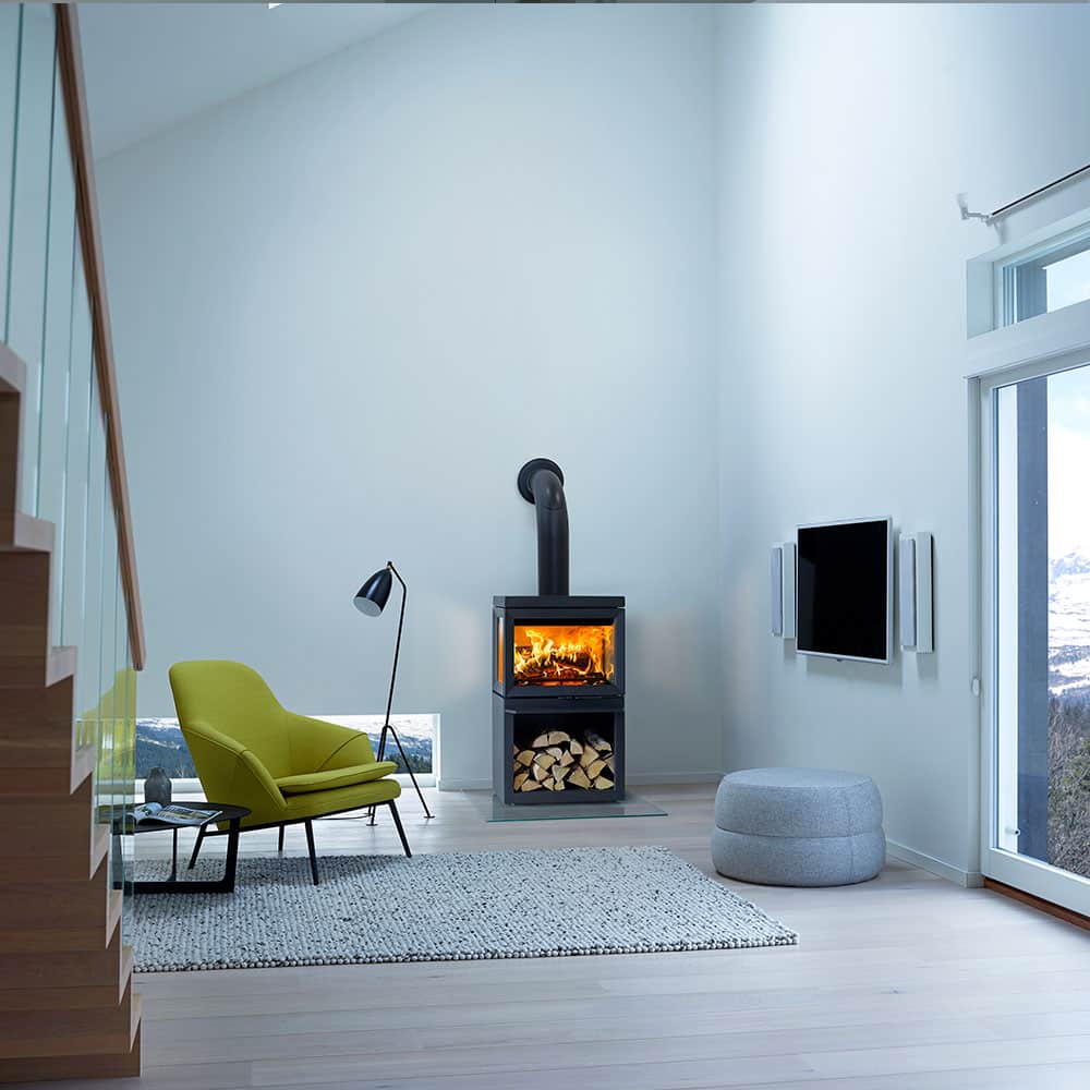 Печь сделана на основе популярной каминной топки Норвежского производителя JOTUL I 520 которая установлена на базе, с метом для хранения дров. Также, как и данная топка, печь футерована вермикулитом, хорошо регулируется заслонками подачи воздуха и работает в режиме длительного горения. При хорошем уровне горения стекло топки самоочищается, так как потоки горячего воздуха направляются на стекло, препятствуя оседанию сажи на стекле камина.
