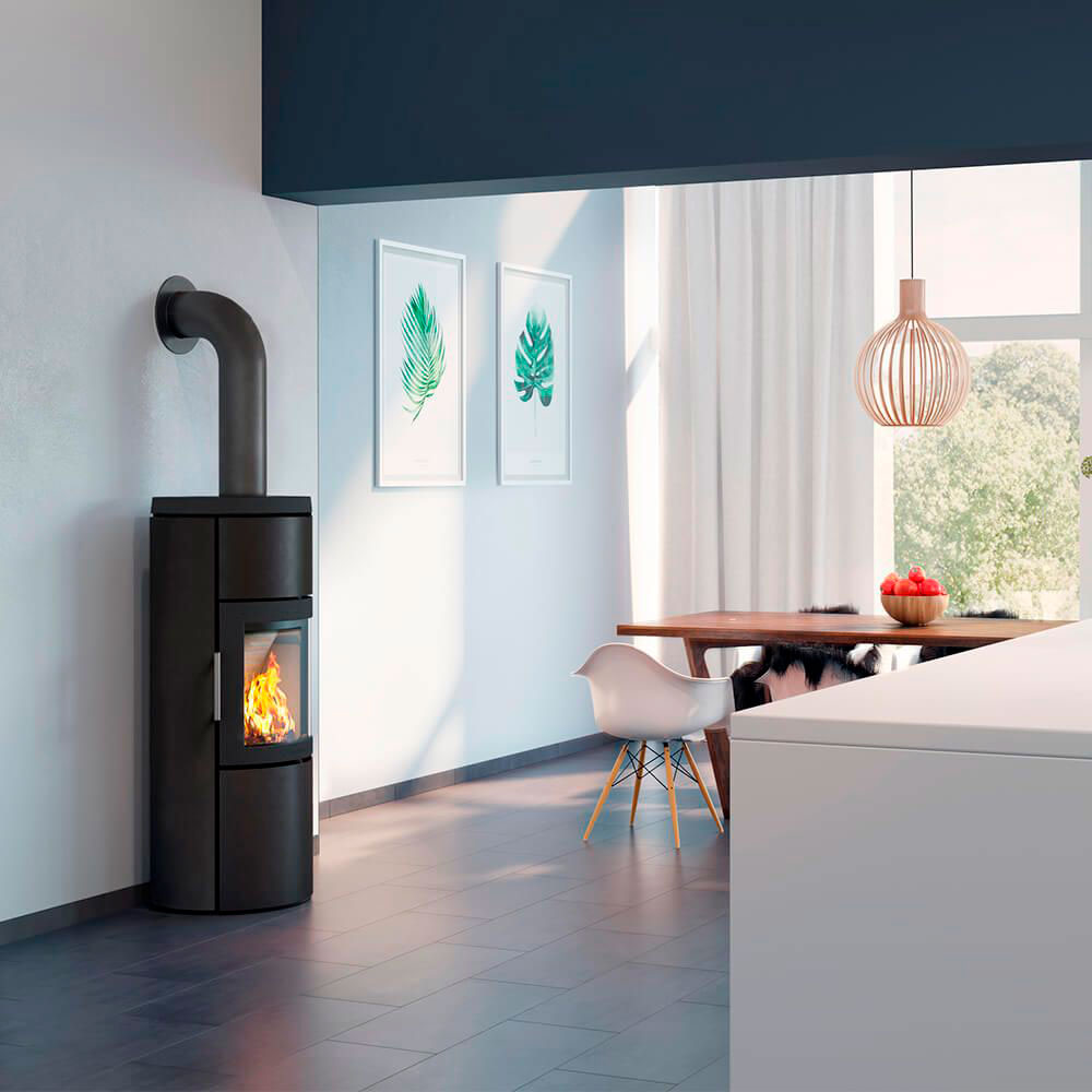 Современный отопительный камин HWAM 3520m с возможностью установки тепло аккумуляционной массы, с автоматической регулировкой уровня горения с двойным дожигом, черного цвета, обеспечивает мощность 4.8 кВт, отапливаемый объем до 60 м3.