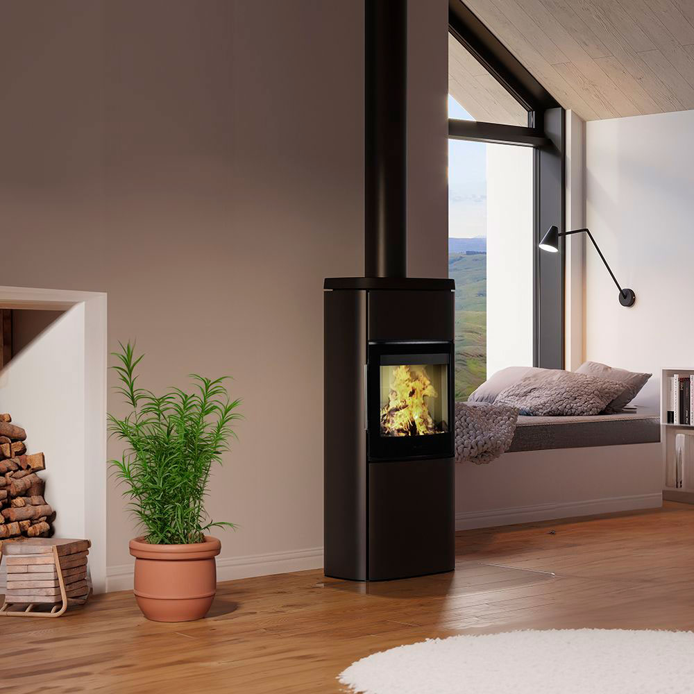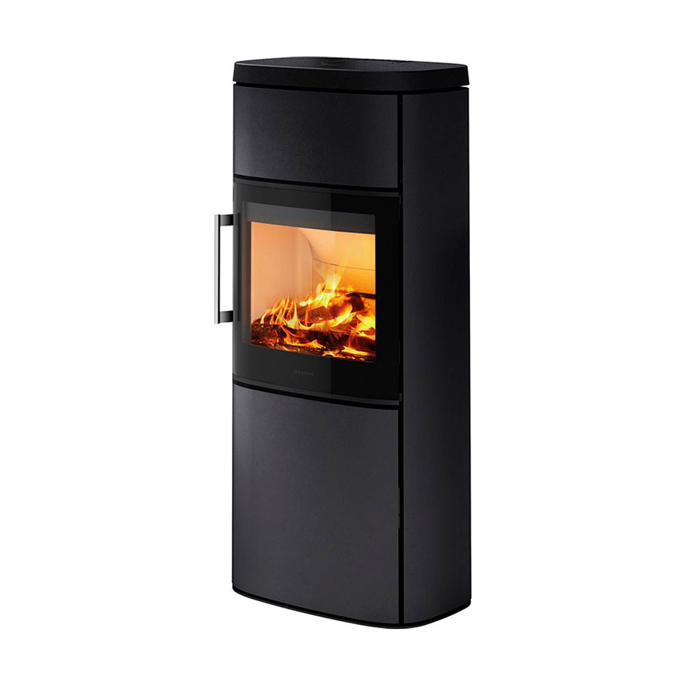 Современная печь длительного горения HWAM 4660m с возможностью установки тепло аккумуляционной массы, с автоматической регулировкой интенсивности огня, дополнительной подачей воздуха на горение,, в черном цвете, номинальная отопительная мощность 7 кВт, отапливает помещения до 90 м3.