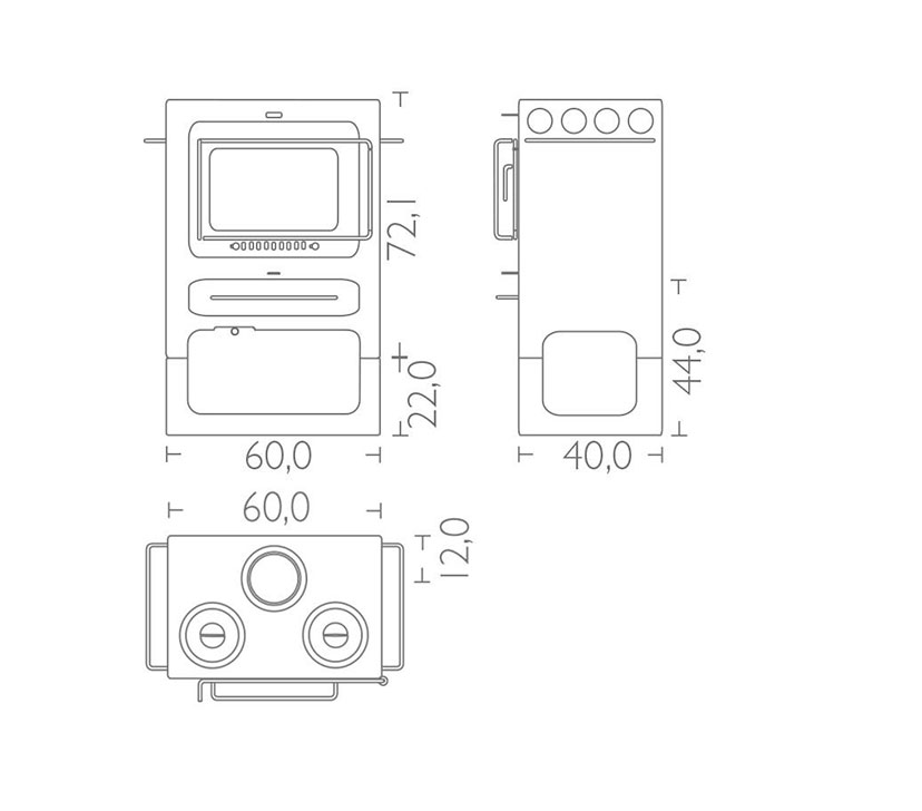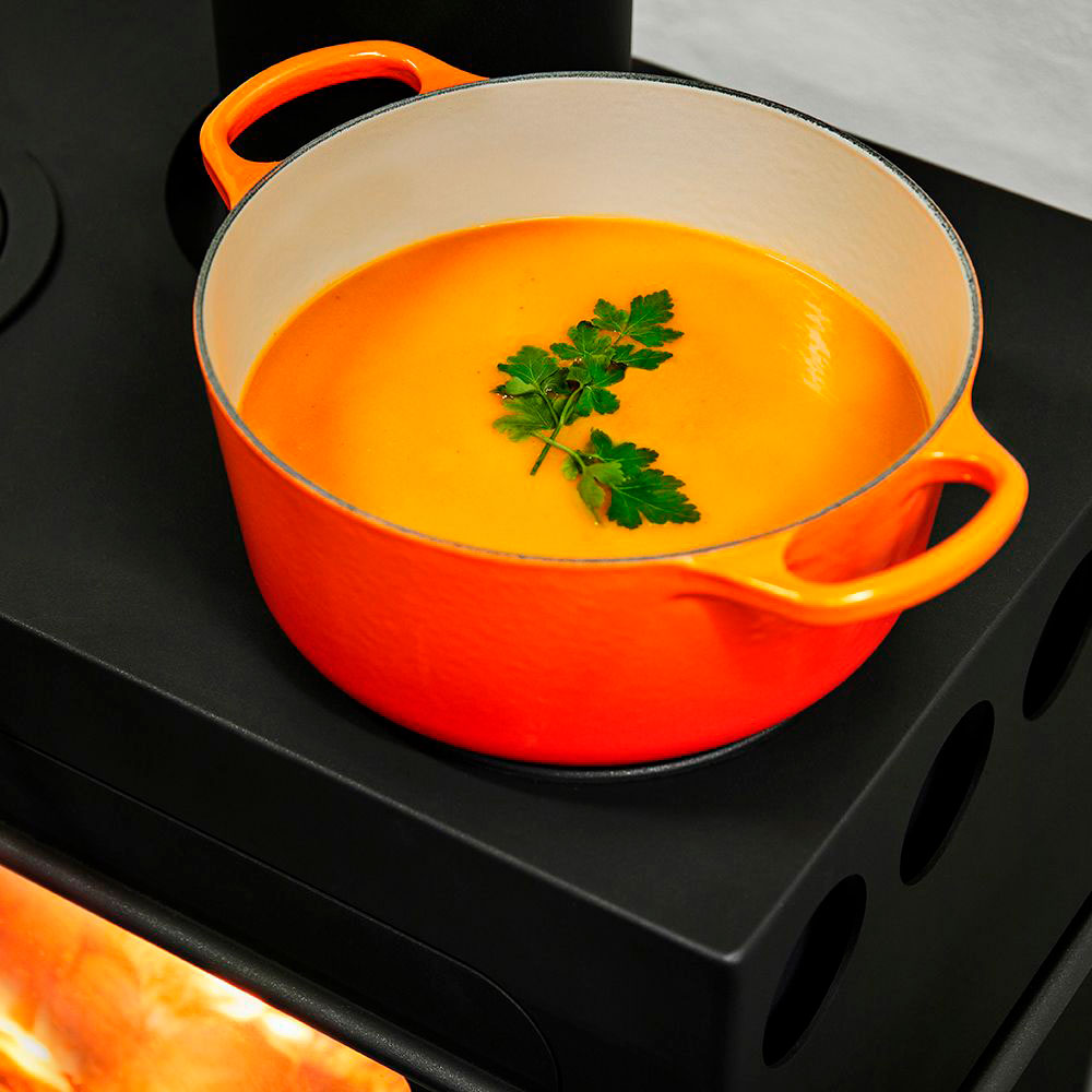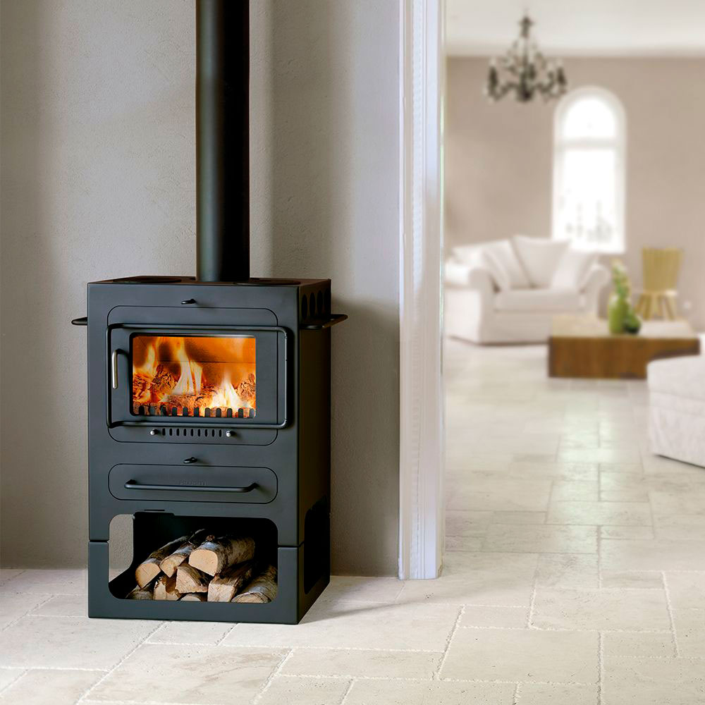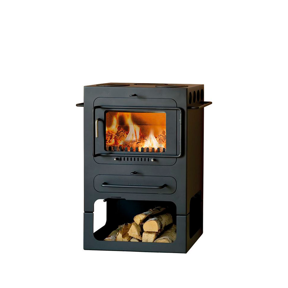 Дровяная варочная печь с плитой HWAM Classic 4,, в черном цвете с местом для хранение дров, номинальная мощность 8 кВт, отапливает помещения до 100 м3.