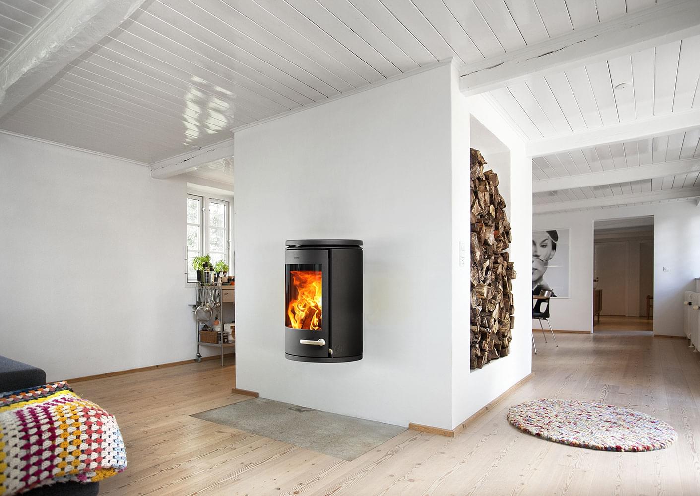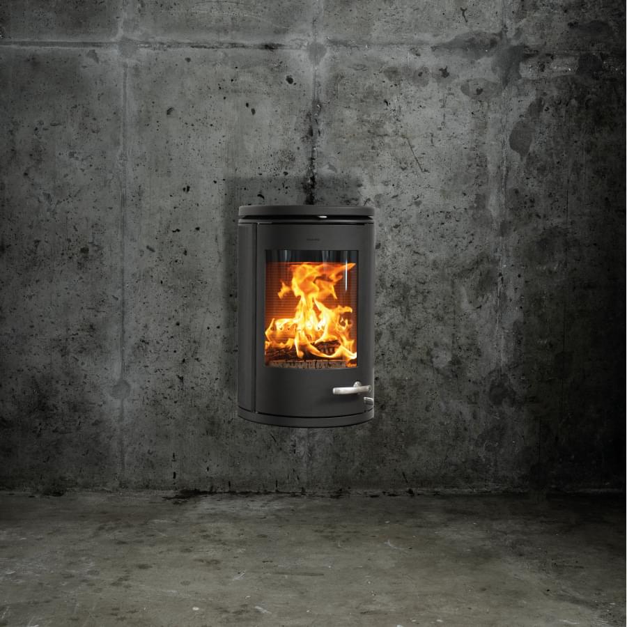 Навесная, настенная печь-камин Morso 7870, с большим стеклом, мощностью 7,3 кВт, отапливает помещения дома от 45 до 120 м2.