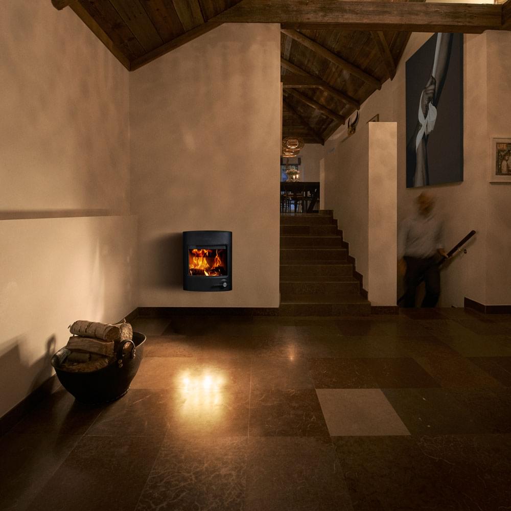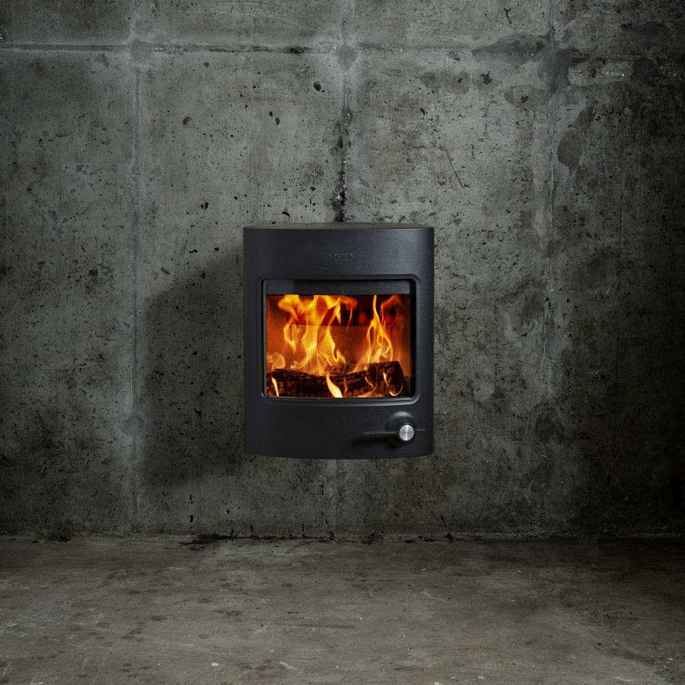 Настенная подвесная печь-камин Morso 2870 с большим стеклом, номинальная мощность печи 4,5 кВт, отапливает площадь дома от 45 до 75 м2.