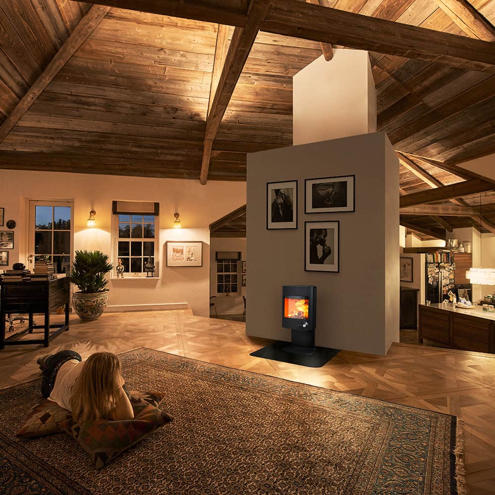 Камин из чугуна со стеклом Morso 2848 на подиуме, отопительная мощность от 3 до 6 кВт, обогреваемая поверхность до 70 м2.