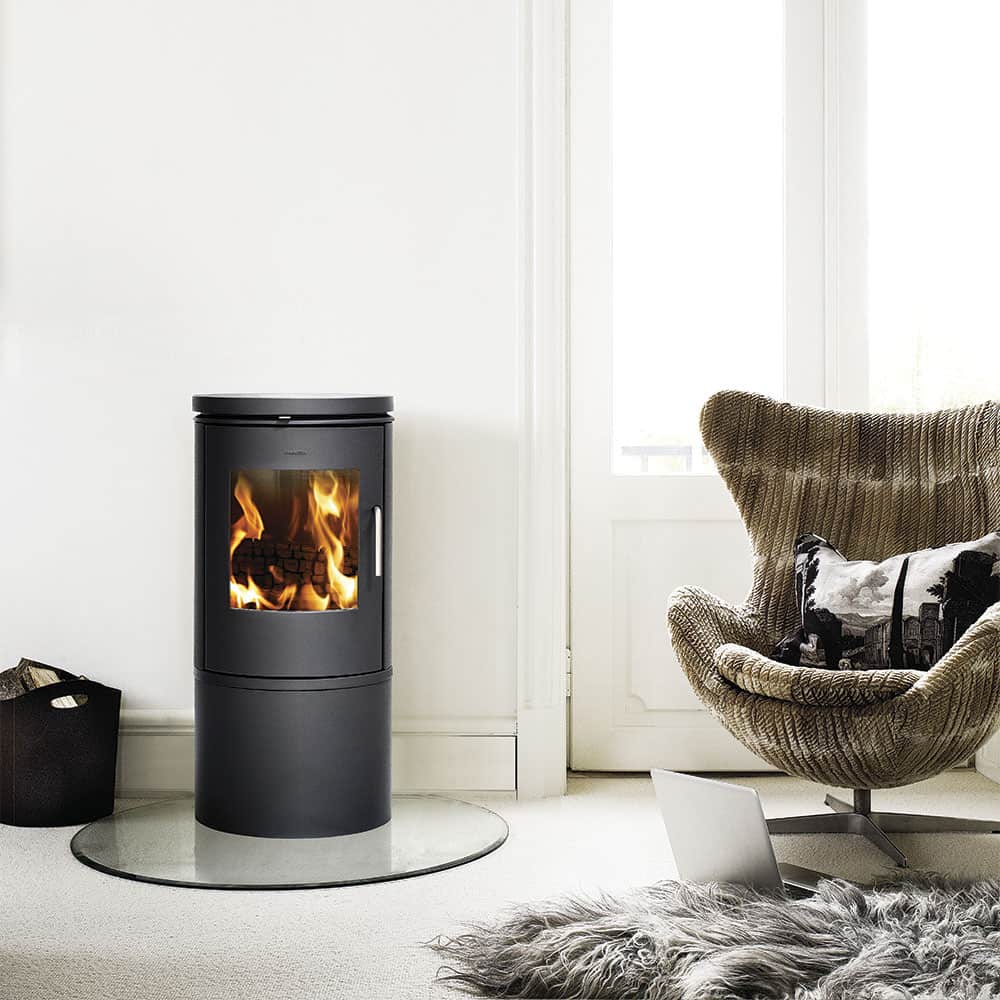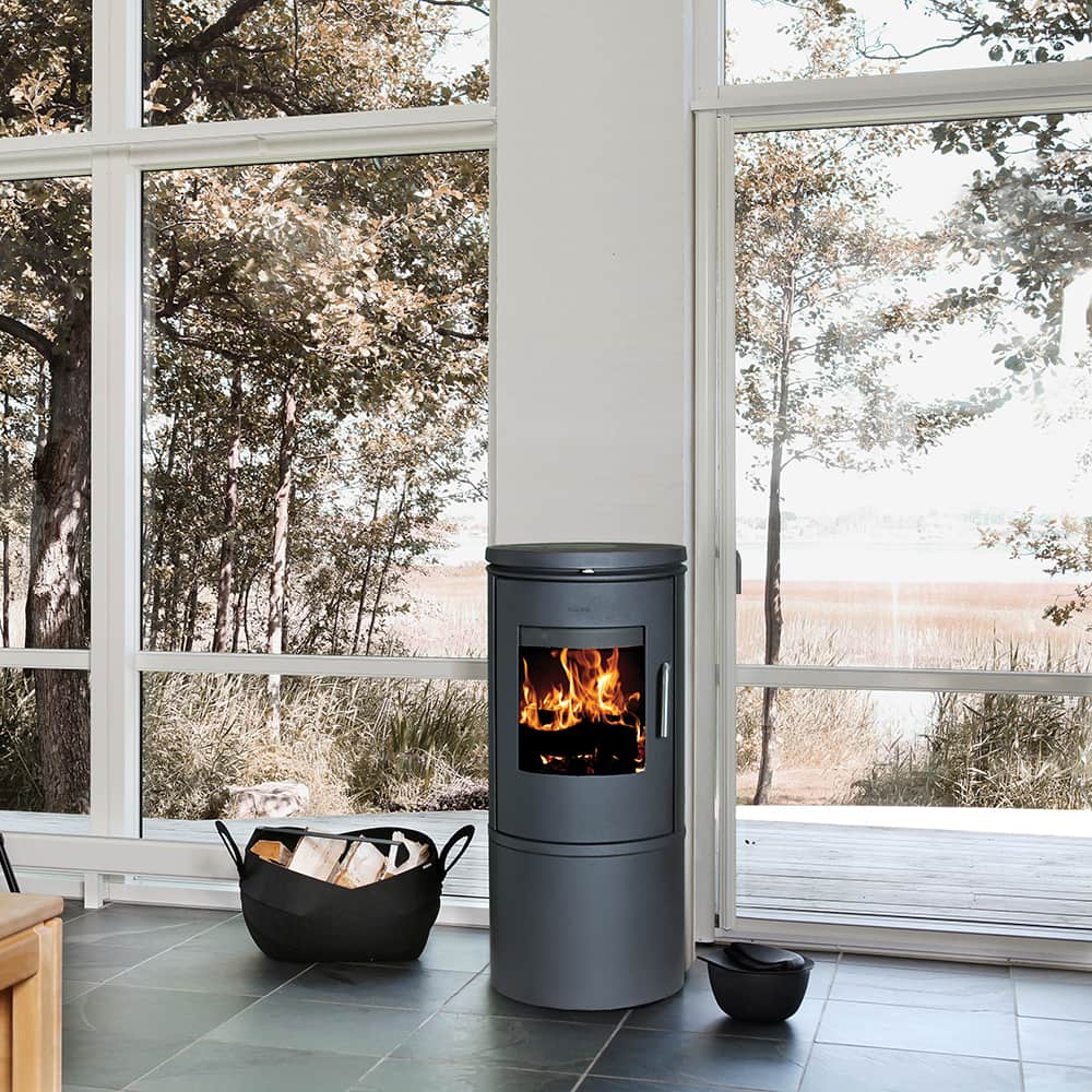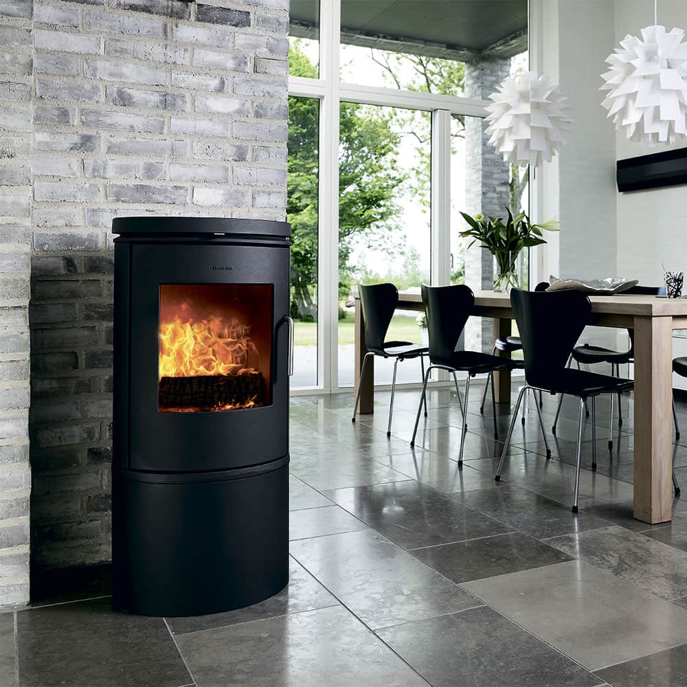 Печь камин Morso 6143 круглой формы, имеет большое каминное стекло, которое в процессе работы печи омывается потоками горячего воздуха и всегда остается чистым.