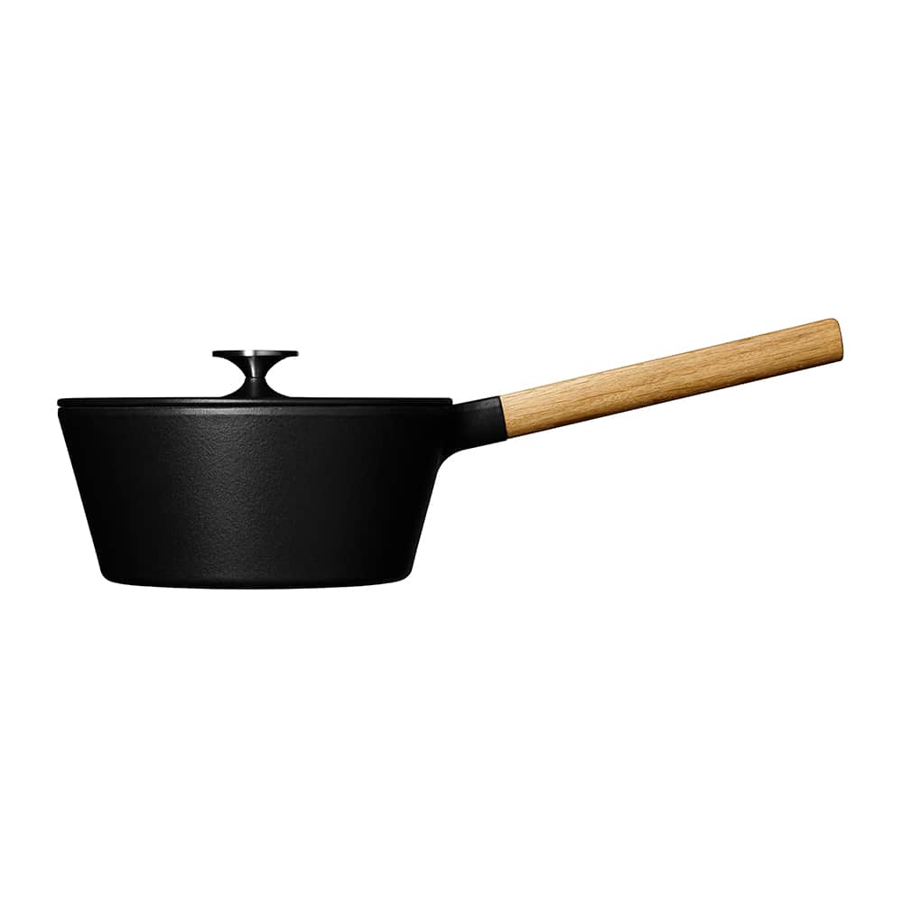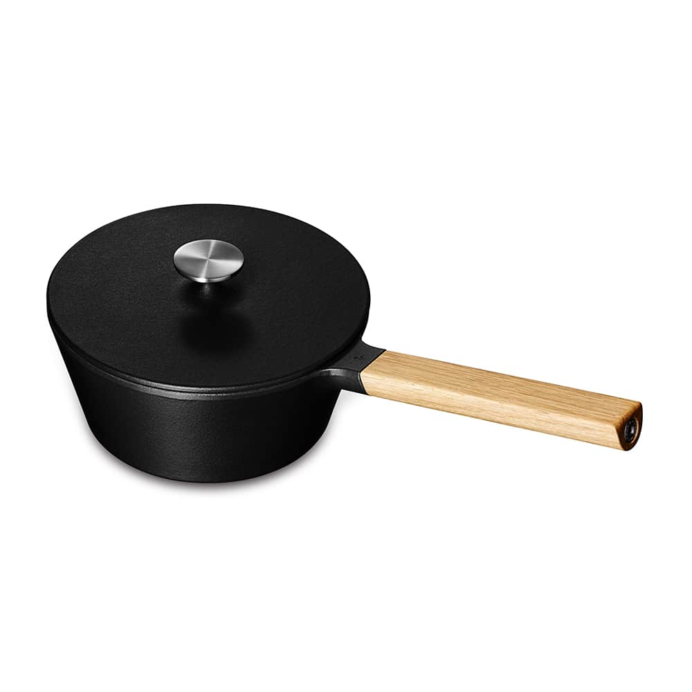 Чугунная кастрюля Morso с крышкой и ручкой изготовленной из дуба, объемом 1,7 литра, идеально подходит для приготовления соусов и варки овощей, риса и пасты.