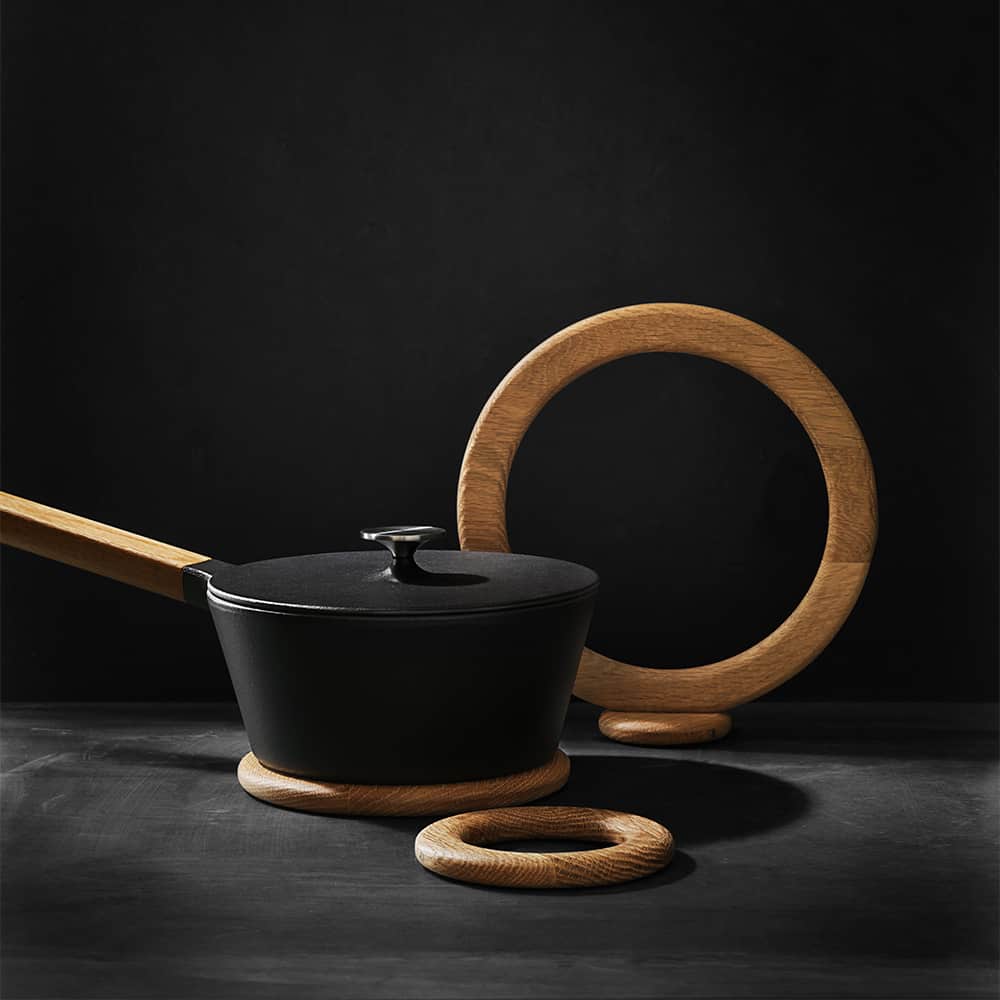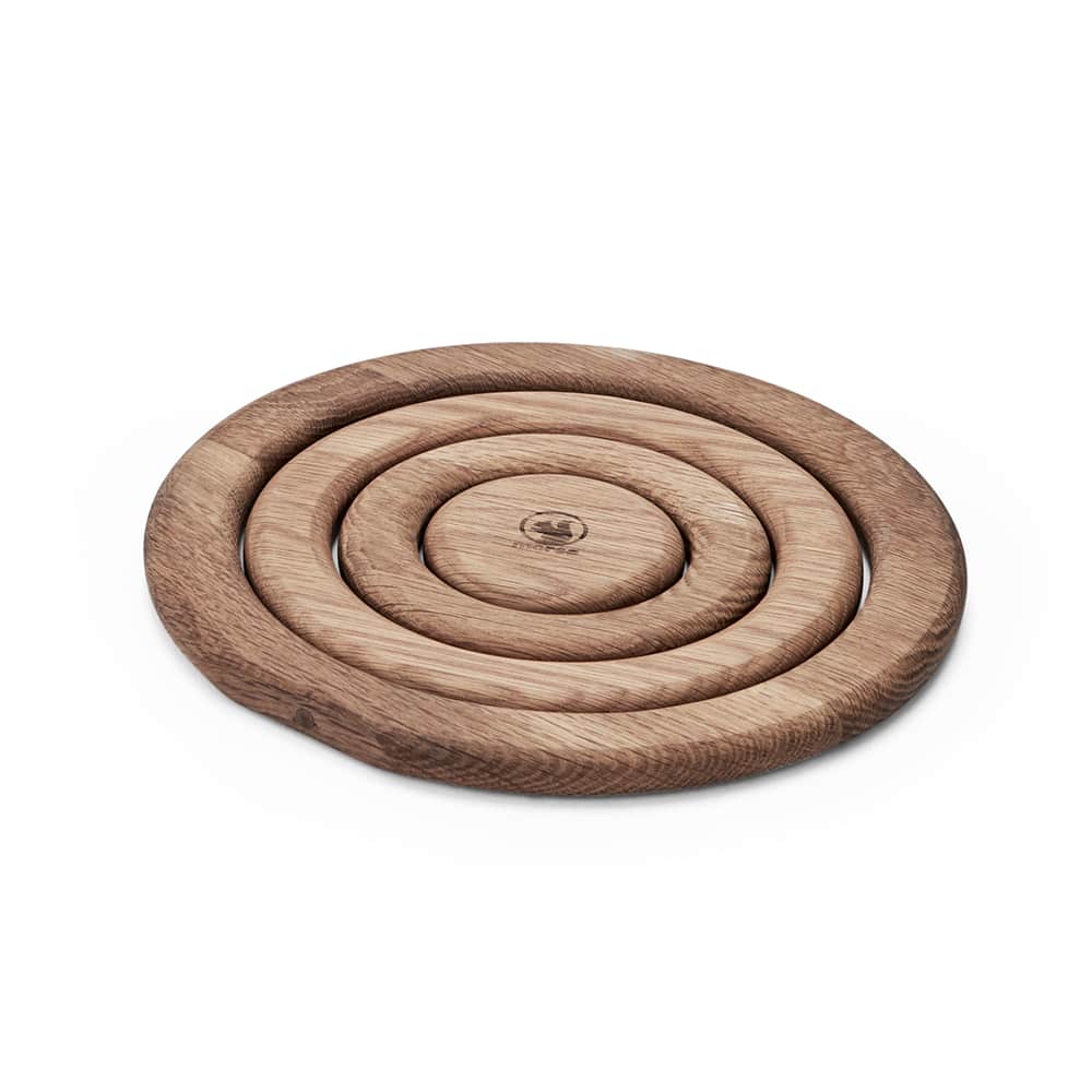 Красивый и функциональный предмет кухонной утвари – подставка для кастрюли, сковороды. Изготовлена из дерева, прочного дуба в форме колец, которые скрепляются магнитами, могут использоваться отдельно друг от друга.