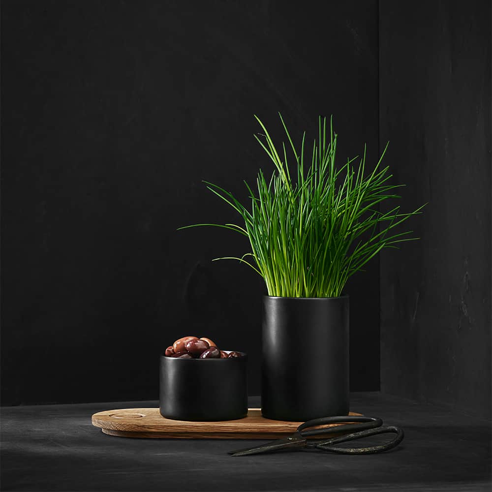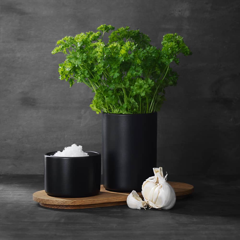 Деревянный поднос Morsø Living - с 2 емкостями для хранения продуктов в комплекте. Поднос изготовлен из прочного дуба, а емкости – различной высоты и объема из черного глазурованного фарфора.